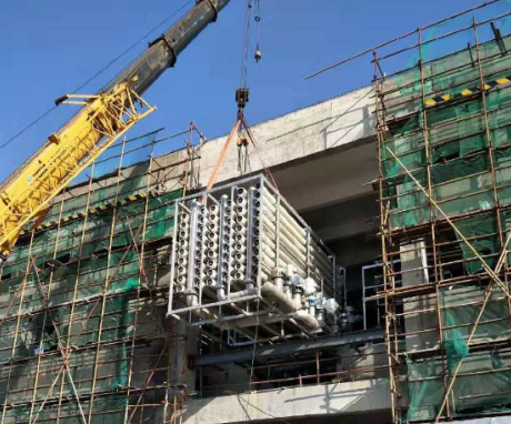 某污水處理廠新建了大型廠房,并采購了八臺關鍵設備——四臺反滲透裝置 + 四臺超濾機組,就在準備將這些設備安裝到廠房內部時,卻犯了難,因為建筑廠房的門框大小已經固定,他們現場平時吊重用的吊車無法順利駛入這個門框內,就在這緊急之時,負責吊裝任務的工作人員利用了多種起重工具,成功解救了吊裝難題。