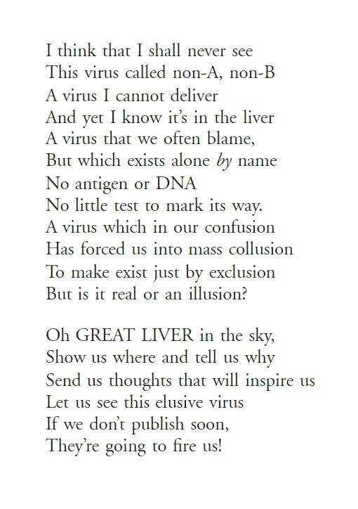 丙肝病毒的發(fā)現(xiàn)過程充滿了曲折,在第一次發(fā)現(xiàn)丙肝感染病例之后,科學(xué)家們花了十余年時(shí)間的努力以圖分離、辨別致病病毒而無果,只能稱之為“非A、非B型”肝炎,逼得當(dāng)時(shí)的Harvey Alter為此而創(chuàng)作了一首吐槽詩: