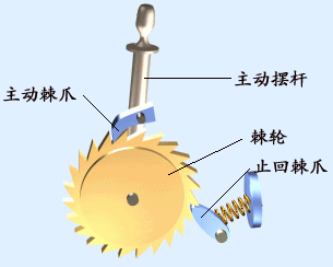 我們先來(lái)通過(guò)圖片了解主動(dòng)棘爪、棘輪、主動(dòng)擺桿、止回棘爪在四個(gè)部分,當(dāng)順時(shí)針擺動(dòng)的時(shí)候,棘爪便會(huì)插入棘輪的齒槽中,棘輪跟隨轉(zhuǎn)動(dòng),止回棘爪從齒背上滑動(dòng);當(dāng)逆時(shí)針轉(zhuǎn)動(dòng)時(shí),止回棘爪便會(huì)死死的卡住齒槽,禁止其逆行。